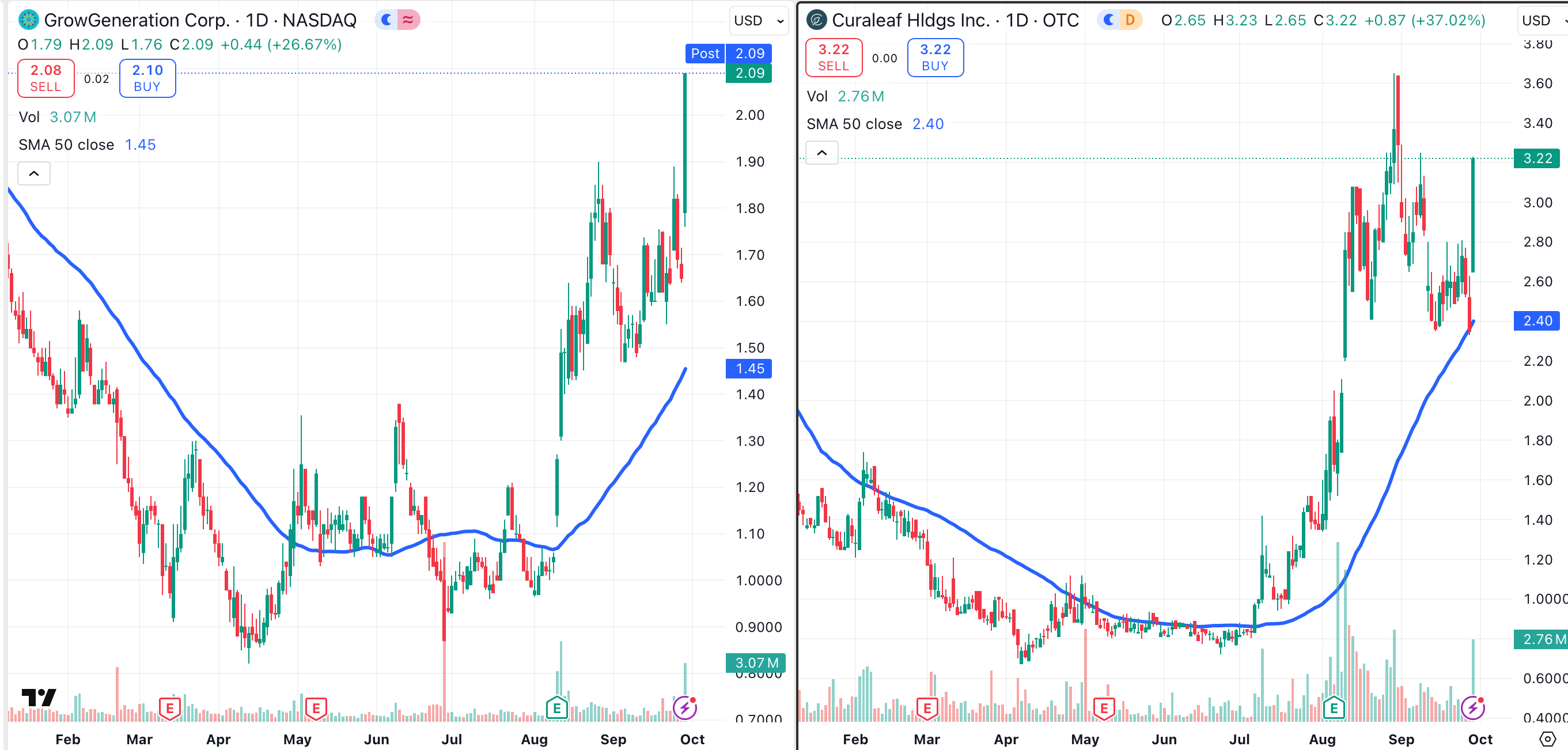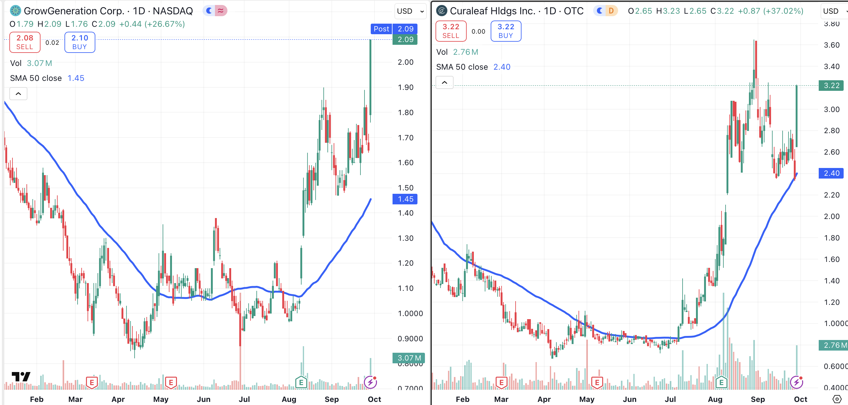 Curaleaf Holdings (CURLF) , which runs a chain of dispensaries, climbed 33%. Colorado-based GrowGeneration Corp. (GRWG) also inhaled deeply, gaining 26.6%.
