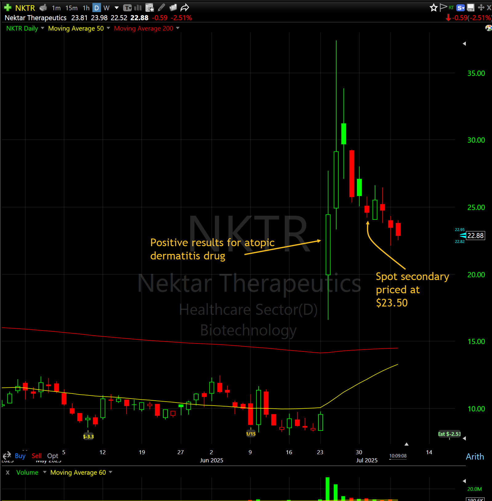 Nektar did a quick spot secondary offering on July 1 at $23.50. The stock has moved below the offering price by about $1, which I believe is a good opportunity to take a small initial position. There isn’t any immediate catalyst on deck, so the stock may continue to drift around, but I want to put it on my radar screen and watch how it develops.
