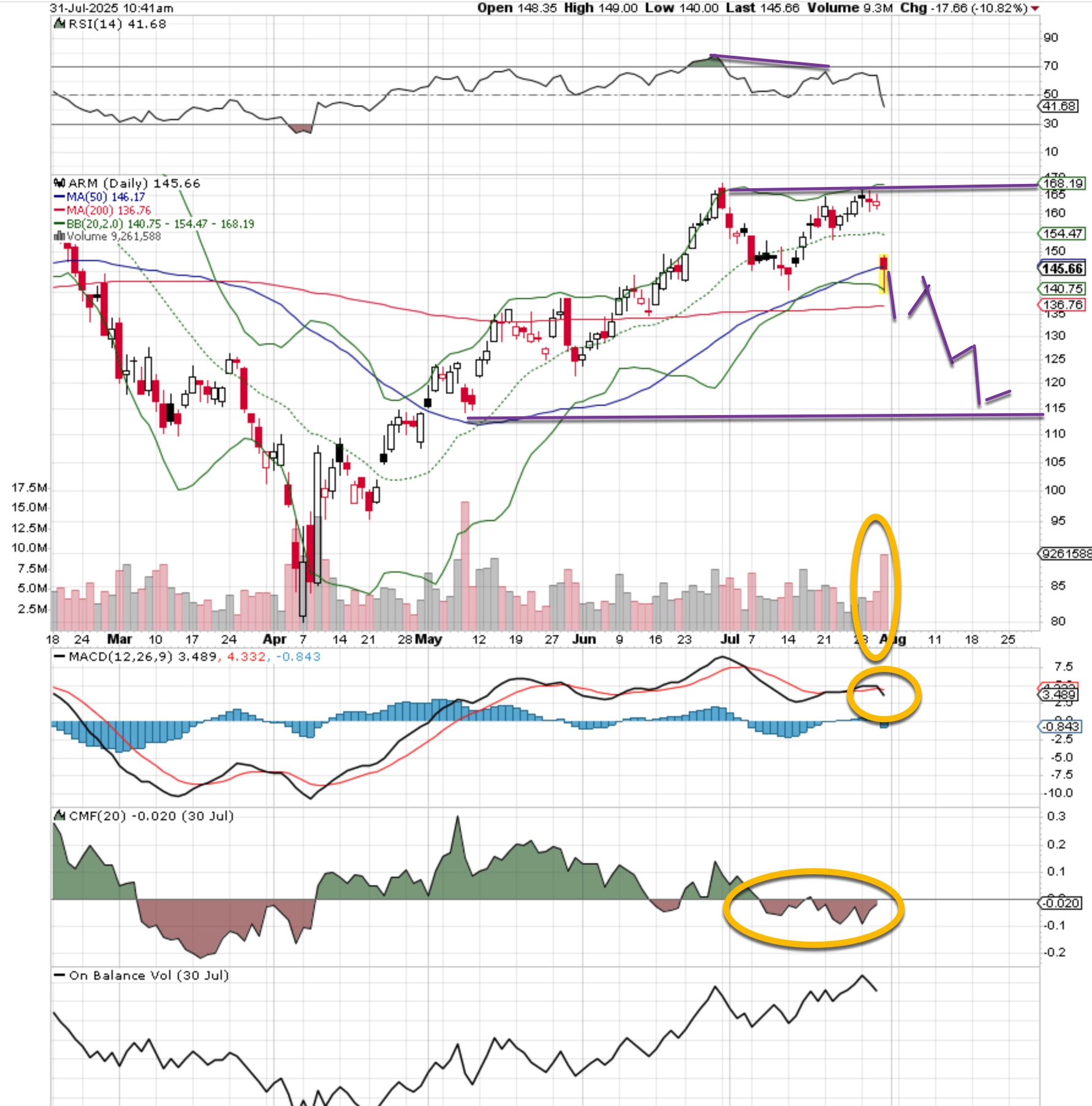 With some really nice earnings this past week and solid chart action it was a bit surprising to see weakness on such big selling volume from ARM Holdings ARM. After all, the stock had been on a roll since bottoming in April. A series of higher highs, higher lows intact, is our textbook definition of an uptrend. But what goes up often goes down and that means ARM is in some trouble here.