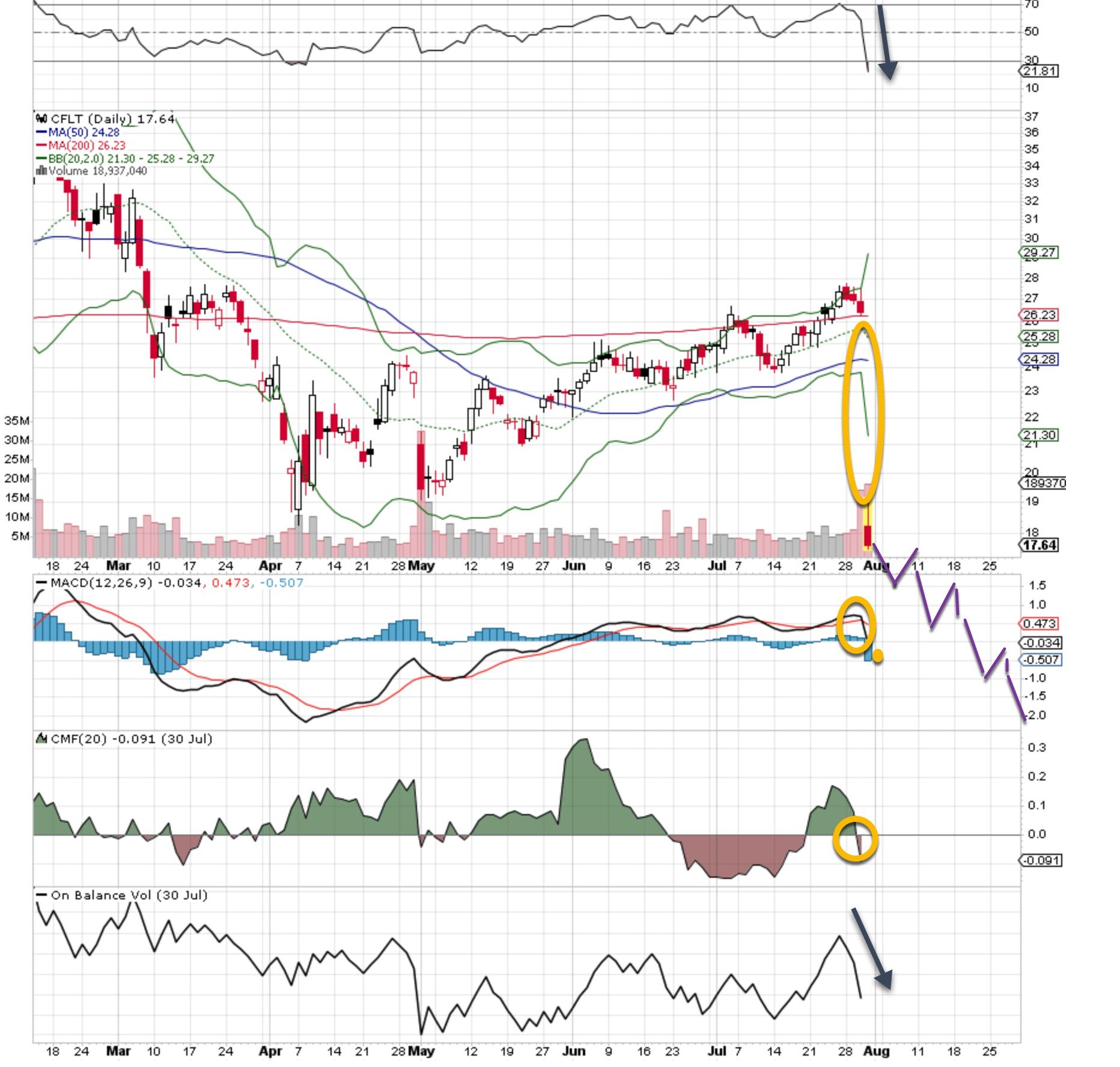 What an ugly session Thursday for Confluent CFLT as the stock just nosedives into new lows. The stock has only been trading since 2021 but this latest move shot a hole into the recent uptrend. The wipeout move this week was on heavy volume, again another sign this trend is shifting bearish.