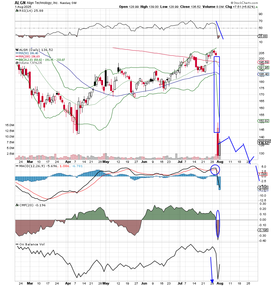 Align Technology (ALGN) just got smashed this past week on heavy volume. The big gap left a hole in the chart the size of the Grand Canyon. Sellers just threw in the towel on the downside surprise earnings, and there could be much more downside to go before it is over. Selling is hardly ever finished on the first day, and that means lower targets ahead.