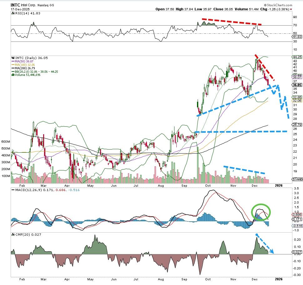 A huge fall for Intel (INTC) over the last few days, some would say it was just to the lower end of a support zone but that intense selling volume is telling us something different. Money flow has really slowed down, the MACD on a fresh sell signal and the RSI at the top is pushing lower.
