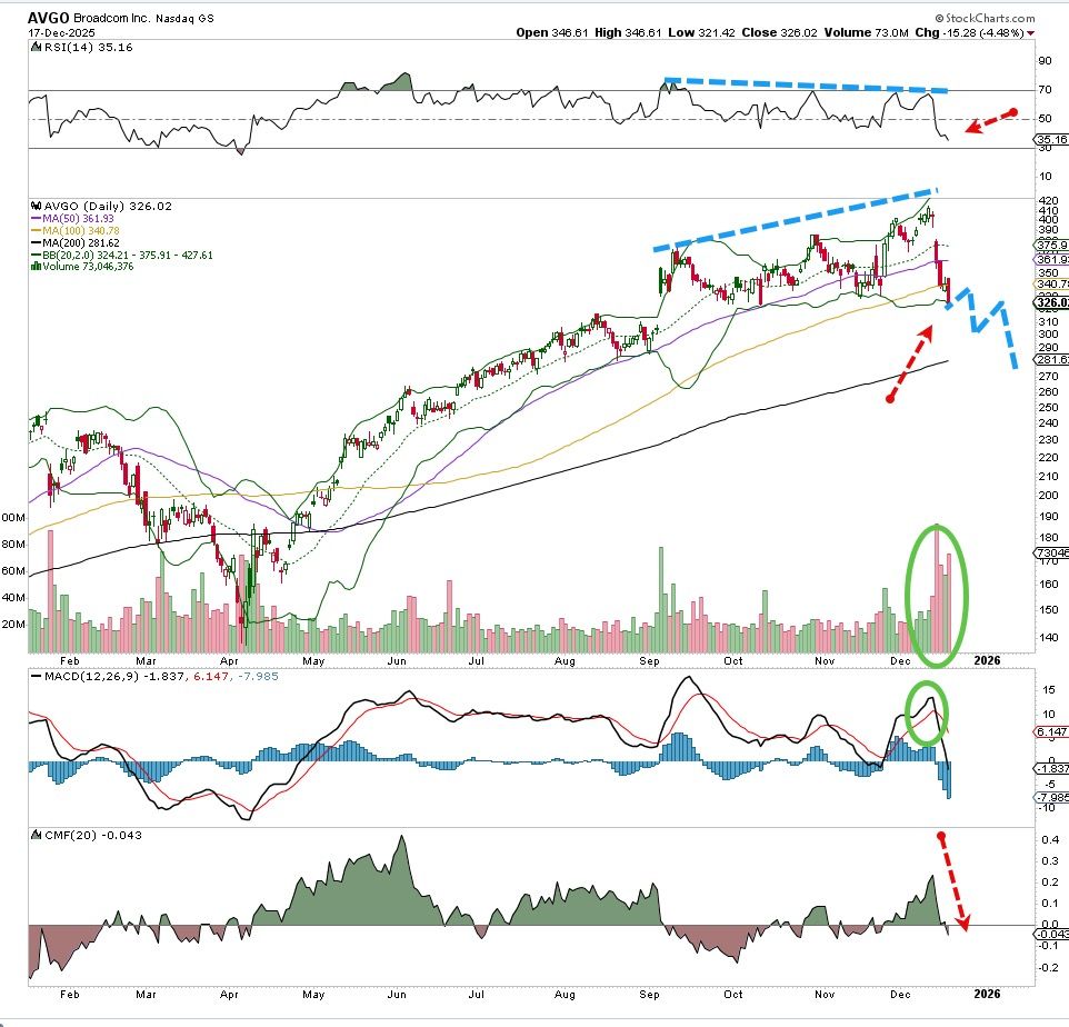 This stock Broadcom (AVGO) has been on a remarkable run for months, but eventually the heavy buying was going to catch up to it. Money flow is bearish here and the MACD just turned lower for a sell signal, and with breaking the 100-day moving average (top pane) there is now a layer of support sitting much lower, call it the $285 area at the 200-day moving average.