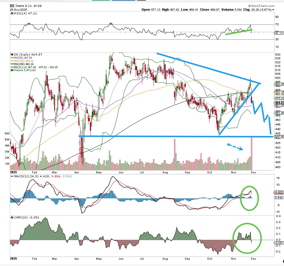 Deere (DE) was pushing the envelope recently, making a nice series of higher highs, higher lows after reaching an interim bottom in early October. The stock rallied, however, on lower turnover, and that is a sign of weakness. You want to see stocks rally on stronger turnover, showing the commitment of big money to accumulate the stock day after day. That hasn't been the case lately for Deere.