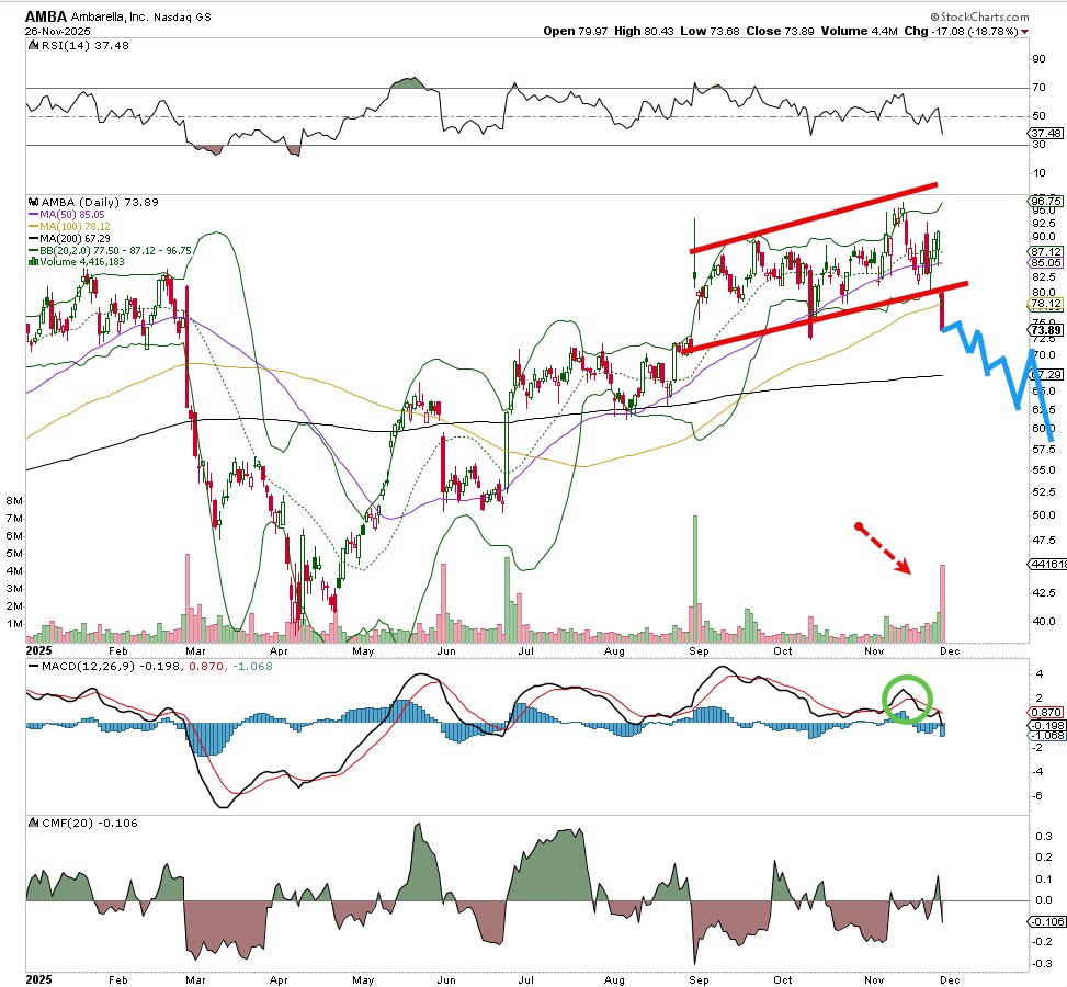 Here is another name that showed nice improvement, a bullish chart pattern and strong volume trends. But it was a mixed earnings report that caused the stock of Ambarella (AMBA) to implode, and while the move was large on 11/26 it is likely to move even lower than current levels.