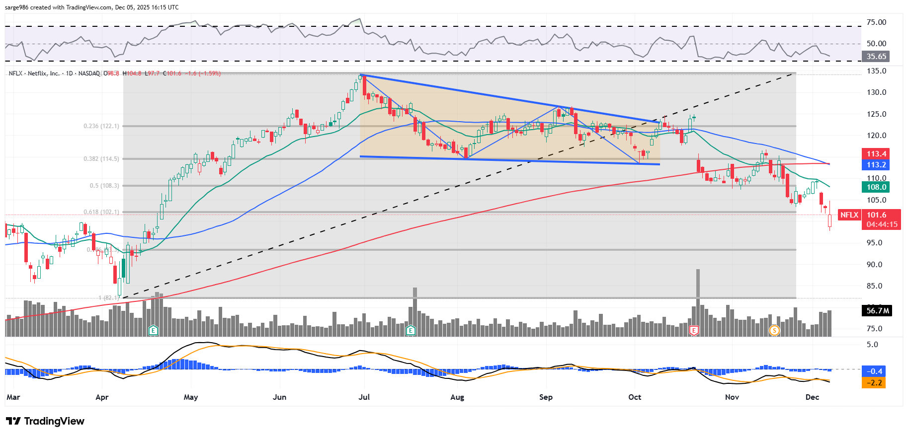 Want more? OK. On Thursday, Netflix suffered a death cross as the stock's 50-day SMA fell below its now (literally just now) declining 200-day SMA. This next item is really important. NFLX is fighting on Friday to hold onto the 61.8% Fibonacci sequence retracement level of its early April into late June rally. Losing this level would possibly set up a fall to the stock's 78.6% Fib retracement level (close to $93).