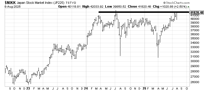 I was asked to look at a weekly, three-year chart of the Nikkei. Not only does it have resistance here in this 41,000 area, but if I took the chart back to 1989-1990, I can tell you the Nikkei bubble burst when it was just shy of 40,000, so this area is quite a big deal. I am not good at chasing what is up already, so I will just note that there is a next target around 44,000, should it get through here. The daily chart looks a bit over-extended.