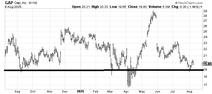 Gap GAP is desperately trying to hold and build a base in this 19 area. The stock has a yield over 3% now! I am tempted to bottom fish it on a pullback near 19 using a stop not far below that, but in the big picture, the chart mostly looks sideways, call it 19-23.