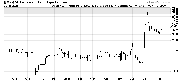 I know nothing about Bitmine Immersion Technologies BMNR, but if I had to guess, it was a SPAC at some point. I am not a fan of chasing a stock that has gone from 30 to 50 in three days, so I will just say that as long as it stays over 40, it gets the benefit of the doubt.