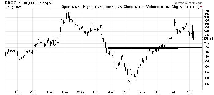 Datadog DDOG had a rally on Thursday that filled the gap left from the late July drop. It’s got some support back around 120. Perhaps the only thing it has going for it is that it has been added to the S&P, so maybe it gets dragged along, but lately that hasn’t been much help.