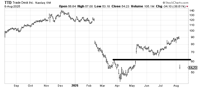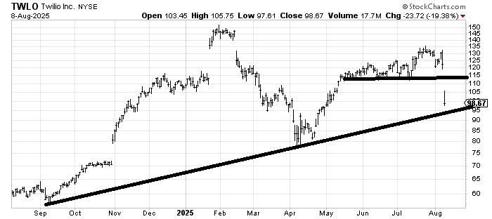 One was Walmart WMT, which sat there for nearly four months before it finally felt better, and I recommended it last week. It has since perked up. But another was Twilio TWLO, which kept threatening to break and couldn’t. Perhaps that rally in July just ran in all the shorts because Friday the stock plunged 20%, blowing right through that support. About the only good news I can share is it has some support around 95.