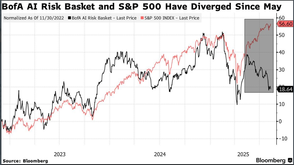 Bank of America has an AI Risk Basket of stocks. These are names they believe are at risk of struggling as AI takes hold. This chart shows the S&P (red) with this basket, and it highlights the divergence since May.