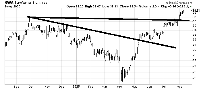 I was reminded that over a year ago, I recommended BorgWarner BWA and was asked for a target. There is a target in the 40-42 area.