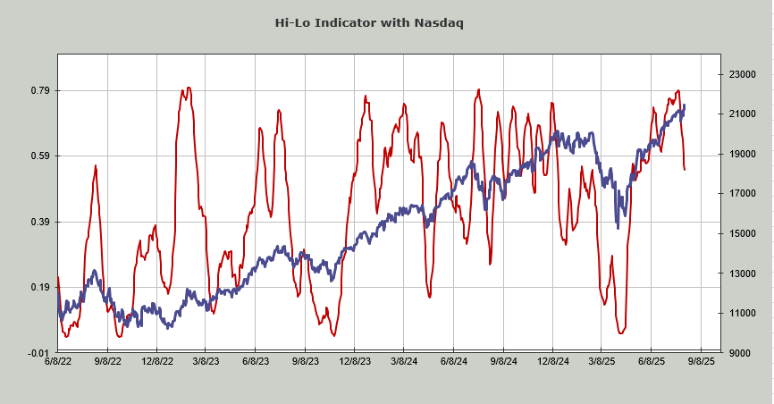Breadth has begun to lag. The SOX has begun to underperform. The Banks, too. The number of stocks making new highs can’t get out of its own way. Down below, you will see the Hi-Lo Indicator for Nasdaq. You can see the turn down from that intermediate term high in late May (it heads down in early June), but then it revives itself. But now we see the turn down from early July has taken the indicator under the June low.