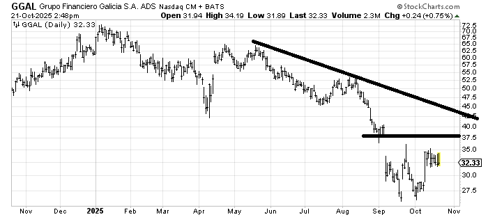 Grupo Financiero (GGAL) is trying to form a bottom, but I think that 37-40 area is going to be a decent roadblock for the time being. I’d like to see this go sideways for at least a few more weeks or months to give me confidence that it can actually eat through all that resistance it left overhead. It’s made some progress by forming that W in the last two months.