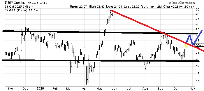 I keep staring at the chart of Gap (GPS) and that long sideways action, wondering if it is building a base or if it will simply continue to bounce back and forth. With the exception of April and May, the chart has been in a four-point trading range for a long time. I’d like to see it cross that red line and then come back and test it as I have drawn in blue. If it can map out like that, it would give me more confidence that it can actually break out. Otherwise, the trading range carries on.