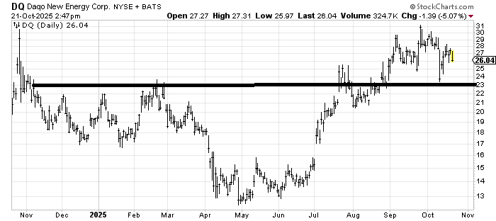 Daqo New Energy (DQ) is not a great chart. It broke out, had a nice run, and then went plop. If it comes back near 23 and can hold, I would take another look at it, but right here I’m inclined to stay away.