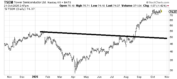Tower Semiconductor (TSEM) hasn’t done anything wrong, but it has met its measured target. Now it needs to either set up a new pattern or spend a decent amount of time going sideways. I’d be inclined to sell some if it breaks 70.
