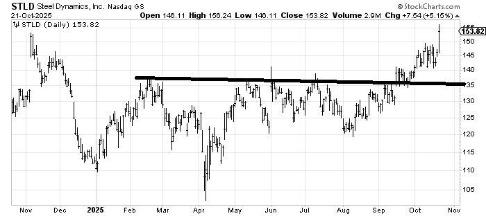 Last spring, I was asked about the steel stocks, and my favorite of the three we looked at was Steel Dynamics (STLD) , which, up until recently, had been a pretty poor choice. There is a next measured target in the 155-160 area.