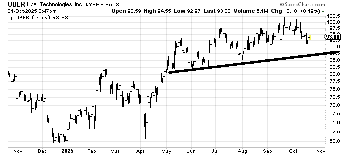I liked Uber (UBER) for the longest time, and it also took forever for it to make its way to that target of 100, which it achieved about a month ago. Now I would say I have no strong view. I think it has a chance of coming down to tag that uptrend line, or it could just slosh back and forth for a while.