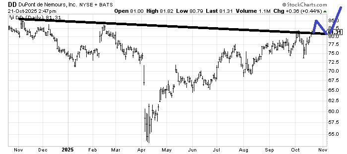 The chart of DuPont (DD) has me intrigued because if we step back, we might consider this a long base in the making. Short term, it is over-extended, so I don’t want to chase it, but I have drawn in blue what would make the chart buyable to me. That means crossing the line (it doesn’t have to go to 85, just cross the line enough to see it) and then pull back and hold that line (call it 80-81) if it can hold on that pullback, I’d be a buyer.