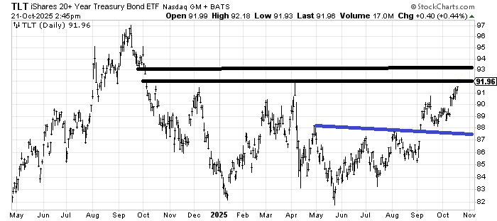 I was asked to update my view on (TLT) . It has not changed. That 92-93 area continues to be my target for the time being. That doesn’t make me bearish on it here. On the contrary, I still think bonds are okay I just think this is a resistance area and I cannot chase. There is a possibility that TLT makes it to 94 just to suck everyone back in because that pattern under the blue line (a head and shoulders pattern I drew in at the time) measures to 93-94. I would also point out that the DSI on bonds is in the low 80s, so here too, we see sentiment would get stretched if we got much over these targets.