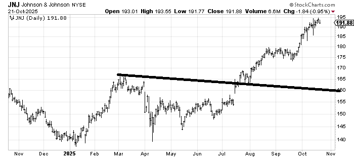 Last spring, I recommended Johnson and Johnson (JNJ) , and it has had a nice run. The stock has done nothing wrong, but there is a measured target in this 190-195 area. It’s not a bad idea to take a little off the table or at least anticipate a correction in the coming weeks.