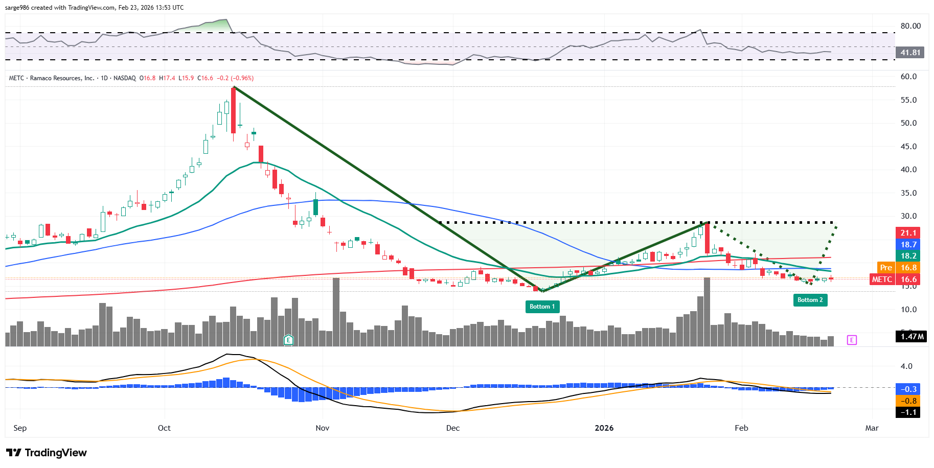 That's probably because the stock spiked sharply and sold off since that time, without showing me anything distinctly technical that I could go off of. At that time, METC was trading around $17.30. The stock closed at $16.56 on Friday night. I gave readers a $24 target price at that time.