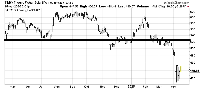 The only good news I have for the chart of Thermo Fisher TMO is that 420 was a measured target. But there is no base, and it hasn’t even been able to fill that gap at 465 yet. For the time being, I’d say a rally—if it shows up—in the 470-480 area is where to sell it.