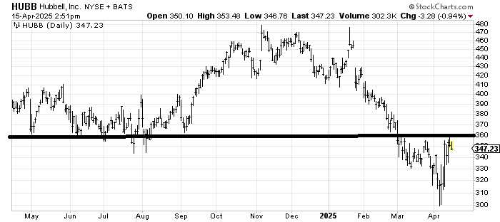In the big picture, Hubbell HUBB has an awful lot of resistance in this 360 area. It is possible that we see it pull back into that 330 area, and it forms a small head and shoulders bottom but market conditions would have to change drastically because that resistance is formidable. For now, watch that 330-340 area on the pullback. Perhaps there is a trade in it.