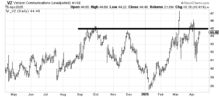 We looked at Verizon a few months ago, and I thought this 45-ish area was resistance. It still is. And that spike high at 47+ is going to be problematic. My inclination is that the stock should, over the next several months, work its way to the 50-52 area. But it is going to take some work.