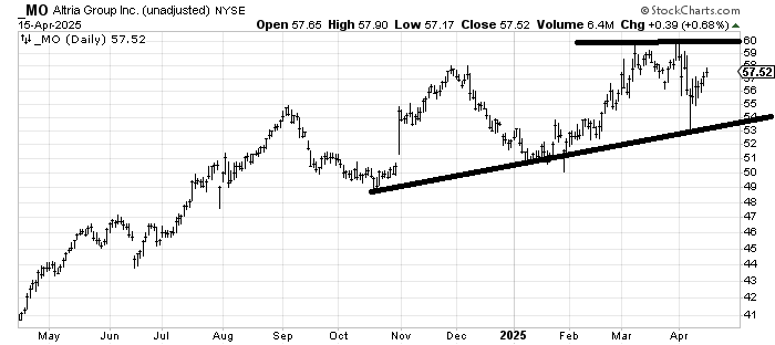 Altria MO is in an uptrend, but here too, the near term has resistance at 60. I would note that while the stock hasn’t done anything wrong, there is a measured target around 56-60 so it is already at the target.