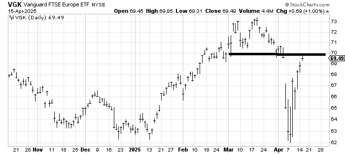 One chart that has had no trouble rebounding is VGK, an ETF to be long Europe. It is now filling the gap, but look at how last Wednesday’s high of 67.50 was surpassed without a hitch whereas the US indexes are mostly still under that surge.
