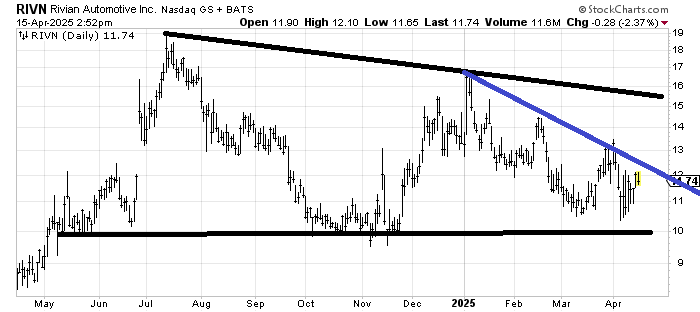 I am intrigued with the chart of Rivian RIVN in that it hasn’t made a lower low. If the chart is going to shape up into something more than intriguing, it will have to cross that blue line and then come down and retest it (over weeks/months), so it is worth keeping an eye on. Right here today though, it is a coin toss.