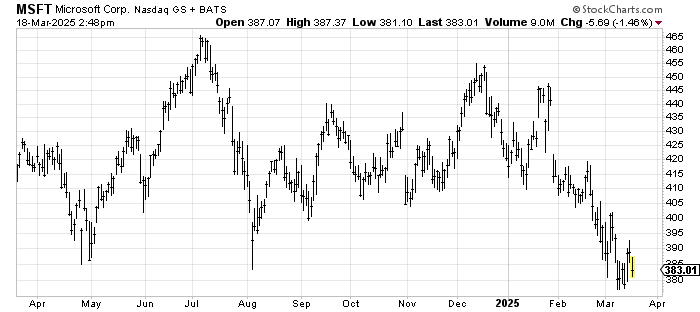 That break on Microsoft MSFT measures to 370 as a first target (there is a longer-term lower target, but let’s deal with what we have right now. The stock got to 378 last week, so it’s close to the target. A rally to resistance around 405 would be a good place to sell some.