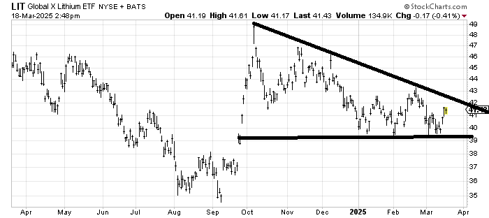 I was asked the same question about LIT, an ETF to be long Lithium because this too appeals to my base building sense. 43 is the level it needs to clear because it has already gotten up there once to eat through the resistance, but eating through resistance is like that old joke: how do you eat an elephant? One bite at a time. Patience is required.