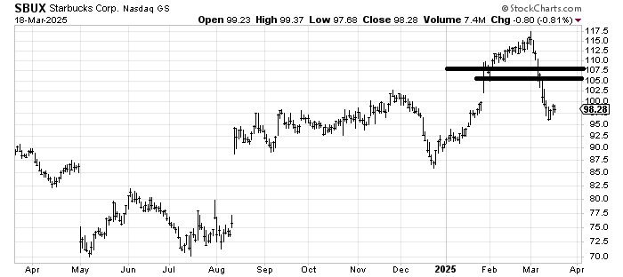 When Starbucks SBUX was up at 115 recently, I said I would sell it. It has since come down and is trying to rally or at least stabilize. If it can rally back to that 105-107 area, I’d sell it there.