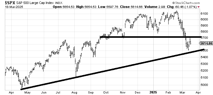 In any event we remain gridlocked between support near 5500 and resistance at 5700. The longer time we spend under 5700, the more bearish the market becomes overall. Let me explain.