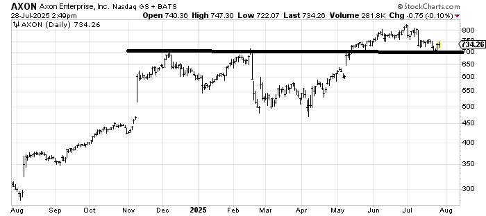 Axon Enterprise AXON has support here. I would like to see it slosh back and forth for a bit, not breaking 700, so it can build some momentum to rally again. Either way, use a stop under 700.