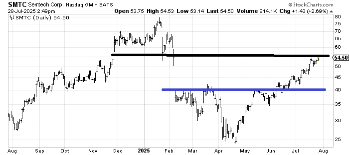 Semtch SMTC has reached its target off that head and shoulders bottom (blue line) that it completed. Maybe it goes on to fill that tiny gap at 60 or even just over 70 but I would err on the side of taking a little something off the table here and then using a trailing stop with the remainder.