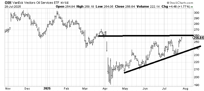 I have been waiting not so patiently for two months now for OIH to close that gap near 260. It came awfully close today. I still like it, but I am going to take a few profits here and then use a stop under 250 on the remainder.