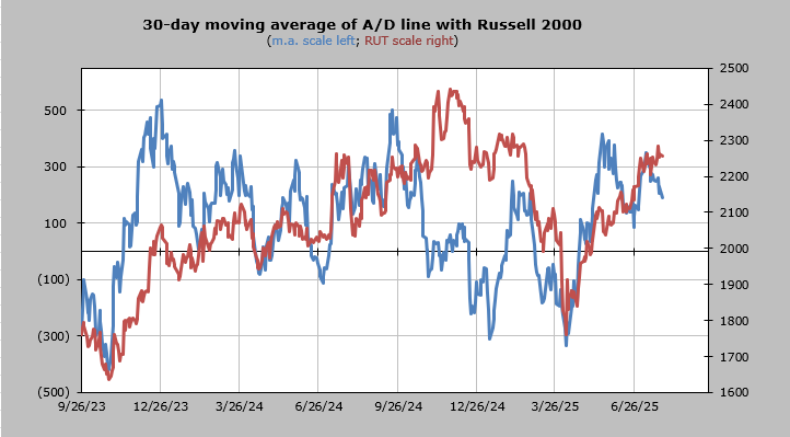 The 30-day moving average of the advance/decline line remains overbought.