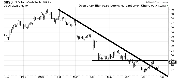 The other thing that happened today was the dollar rallied. But it still has not gotten over that 99 level it got to a week or so ago. I still think it will, but thus far, I’m still waiting. Also, note over 99 is not a breakout per se, just another bite out of resistance.