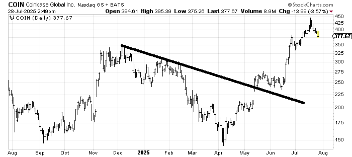 Coinbase COIN hit its measured target a week or so ago, so now I think profits should be taken and we wait for another setup. It’s been a great run. If the stock comes down to 350, then rallies poorly, it will have a head and shoulders top. Oh, it might not do that, but with earnings coming on Thursday, I see no edge in getting long.