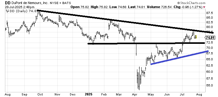 DuPont DD looks to me like it’s trapped between 72 and 78 for now. It reached its first target and has a lot of resistance to chew through. A trip to that blue line is not out of the question. If it gaps up over 80, I would not scoff at it, but right here it looks like so much in the market: exhausted.