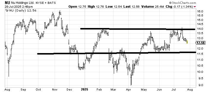 There is something about that 11.50-12 area on Nu Holdings NU that the chart likes. If it comes down there, the risk/reward would be decent because if it breaks it, you know you’re wrong. Otherwise, the chart mostly looks like it is going nowhere.