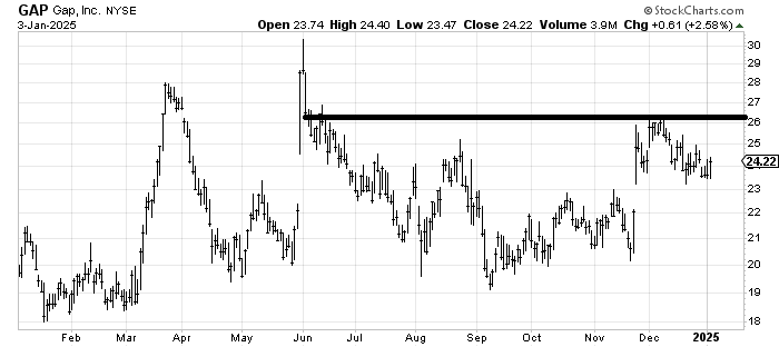 Gap GAP made a high between Thanksgiving and Christmas but it is developing a base. A whack into 22-23 would fill that gap (a positive) but I like the base so I lean toward being a buyer. The only issue is that a stop is quite far away.