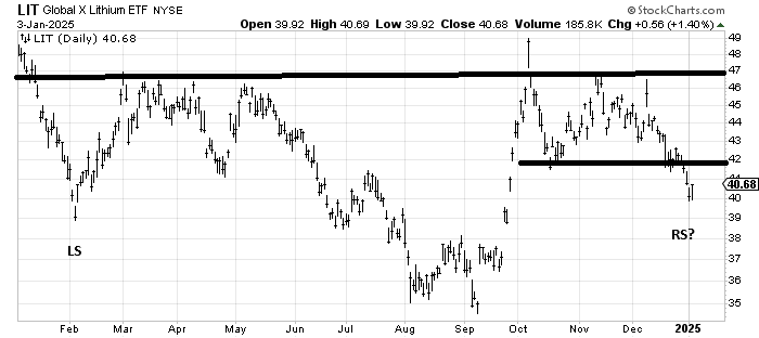 Hope springs eternal with me: is LIT, an etf to be long Lithium forming the right shoulder of a head and shoulders bottom? If it can’t get over 42 then I am wrong.