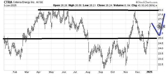 Coterra Energy CTRA has had quite a pop since the FOMC meeting (there it is again!). I would like to see it pullback toward 25-25.50 before it makes another stab at resistance since it is quite over-extended right now. I’ve drawn in blue what would make this chart more interesting to me.