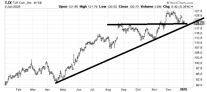TJX TJX proves another point I tend to make: most retailers tend to make a high between Thanksgiving and Christmas. There is support in this 120 area but this is not my kind of chart. It hasn’t corrected enough to be down and out, it met its upside measured target when it got to 127 and it has a gap down from late December. If it rallies and can’t get over 125 I would fret it breaks 120 on the next trip down.